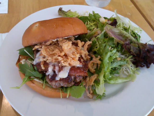 It being lunch, I went for the burger, which was amazing, topped with greens, crispy onions, jack cheese and quality bacon. It also came with a thoughtful, fall-inspired salad featuring local produce.
