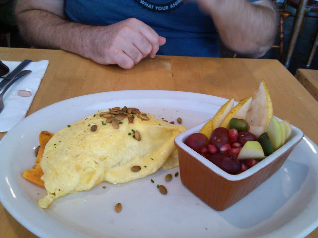 Our friends went a more traditional route with Pear-Pecan French Toast (made with gorgeous, fluffy bread) and a fall-produce stuffed omelette served with one gorgeous autumny fruit salad.