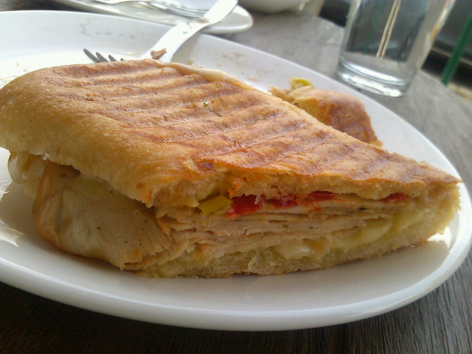 I didn't remember to take a picture of my sandwich until my side salad was gone and I was halfway done, but it was a toasted panini filled with turkey, cheese, and Hungarian peppers for a little heat. So, so good.